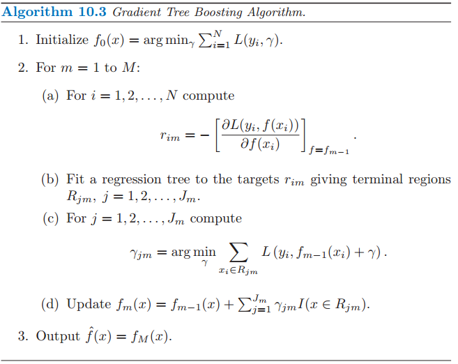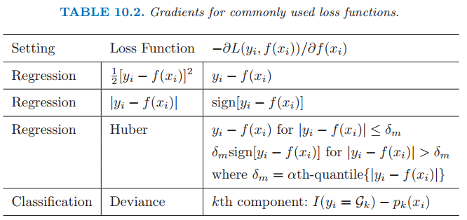 但对于一般的损失函数,往往每一步优化没那么容易,如上图中的绝对值损失函数和Huber损失函数。针对这一问题,Freidman提出了梯度提升算法:利用最速下降的近似方法,即利用损失函数的负梯度在当前模型的值,作为回归问题中提升树算法的残差的近似值,拟合一个回归树。(注:鄙人私以为,与其说负梯度作为残差的近似值,不如说残差是负梯度的一种特例)算法如下: