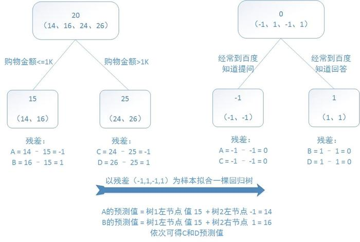 训练集是4个人,A,B,C,D年龄分别是14,16,24,26。样本中有购物金额、上网时长、经常到百度知道提问等特征。提升树的过程如下: