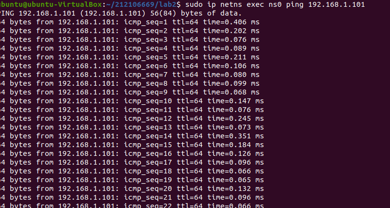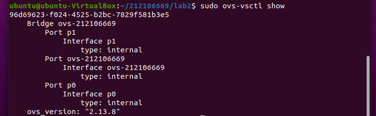 a) /home/用户名/学号/lab2/目录下执行ovs-vsctl show命令、以及p0和p1连通性测试的执行结果截图;
