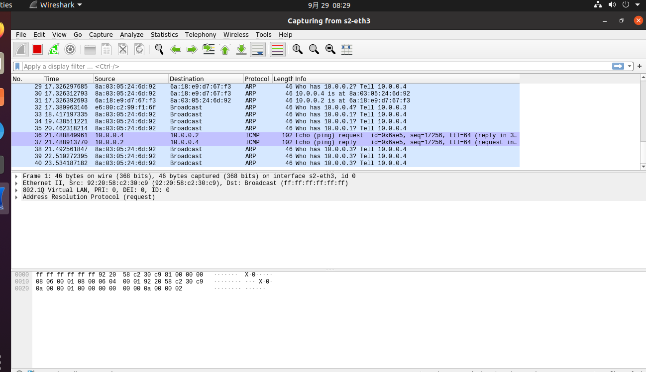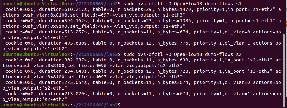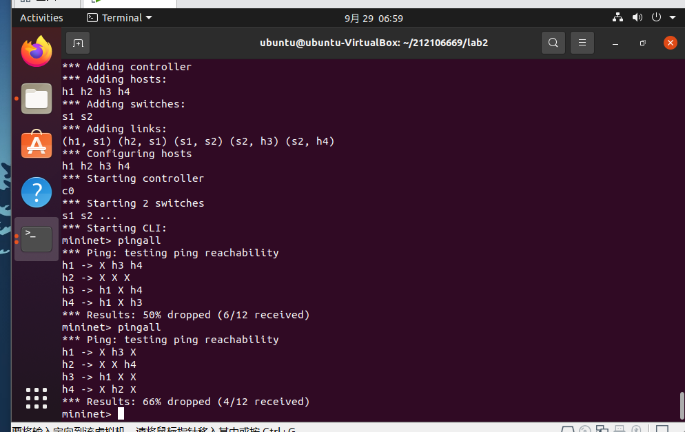 b) /home/用户名/学号/lab2/目录下开启Mininet CLI并执行pingall命令的截图、上述目录下查看OVS流表的命令结果截图,wireshark抓包截图