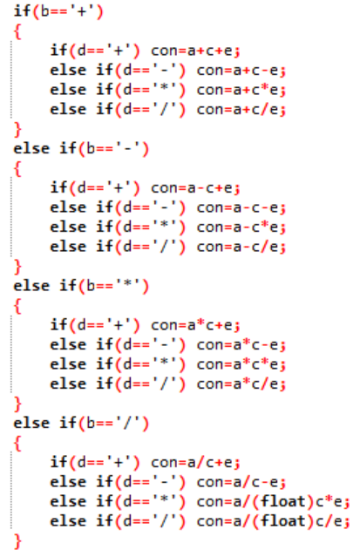 但是考虑到学生做题的时候,做完如果能知道对错并显示答案也许会更好,于是我们考虑在程序里面加上此类功能。但由于我们前面随机生成的运算符其实是以字符串的形式生成,只是简单地在题目中进行显示了,所以程序无法直接利用生成的题目式子计算出答案,在此我们利用了比较笨的方式,利用多个if语句将运算符一一对应得出答案,接着针对学生的答案给出对错判断,错误的话显示正确答案。不过一开始这些代码有些错误,在运行过程中,对于“con=a/ce”以及“con=a/c/e”两个式子无法得出正确答案,后来考虑到也许是因为除号在此处的特殊性,在c之前加上了“(float)”就运行成功了。