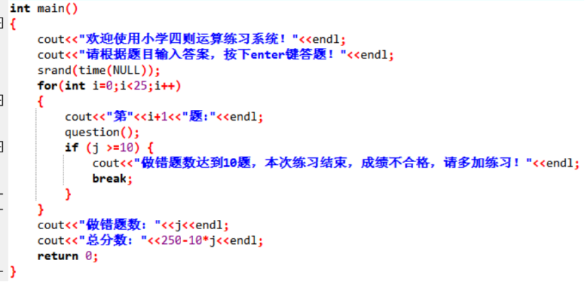 考虑到小学的作业一般老师都会评分或者评级,于是我们在主函数中加上了最终评分的代码,在开头初始化了一个“j=0”来记录学生的错题数目,在最终以满分一百分,错一题扣4分的评分制来计算学生的得分并显示。
