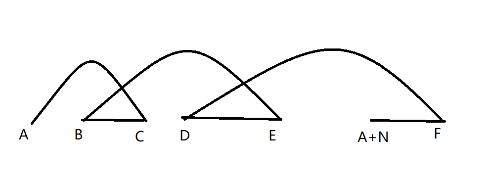 我们考虑一下这个做法的正确性,若存在一条从 \(i\) 到达 \(i+n\) 的路径,显然这条路径上的所有实边能够覆盖整个路径,之后我们可以对这个路径做一些精简,扣去路径中被包含的边,使得路径最后大致长成这个样子: