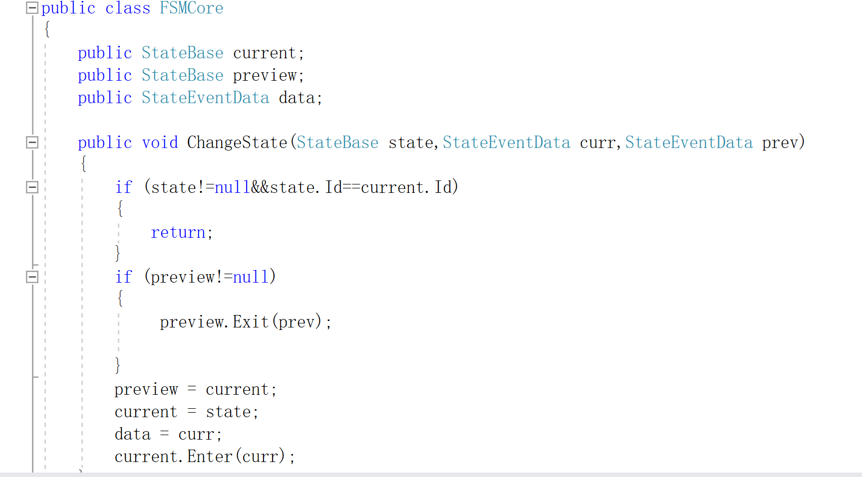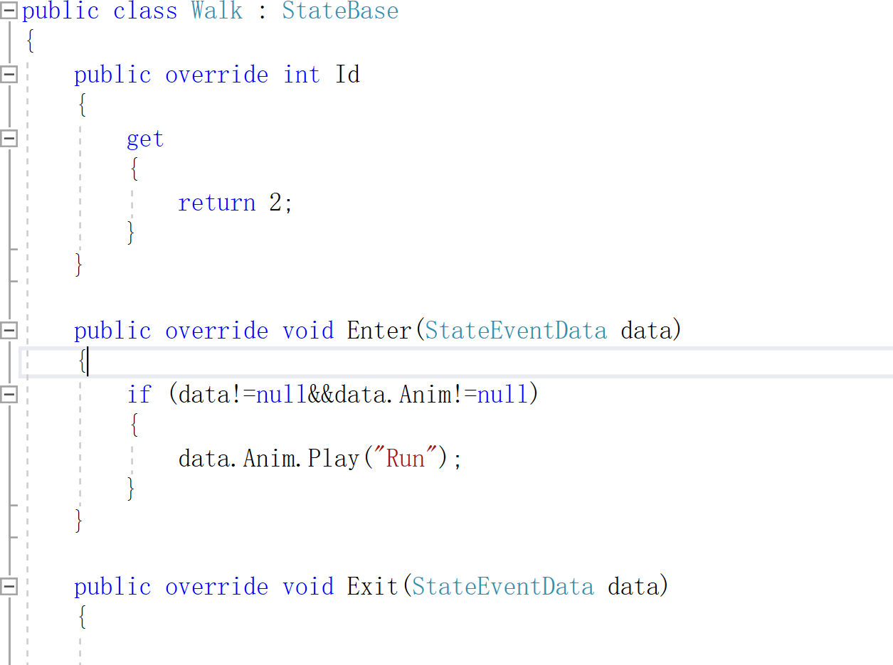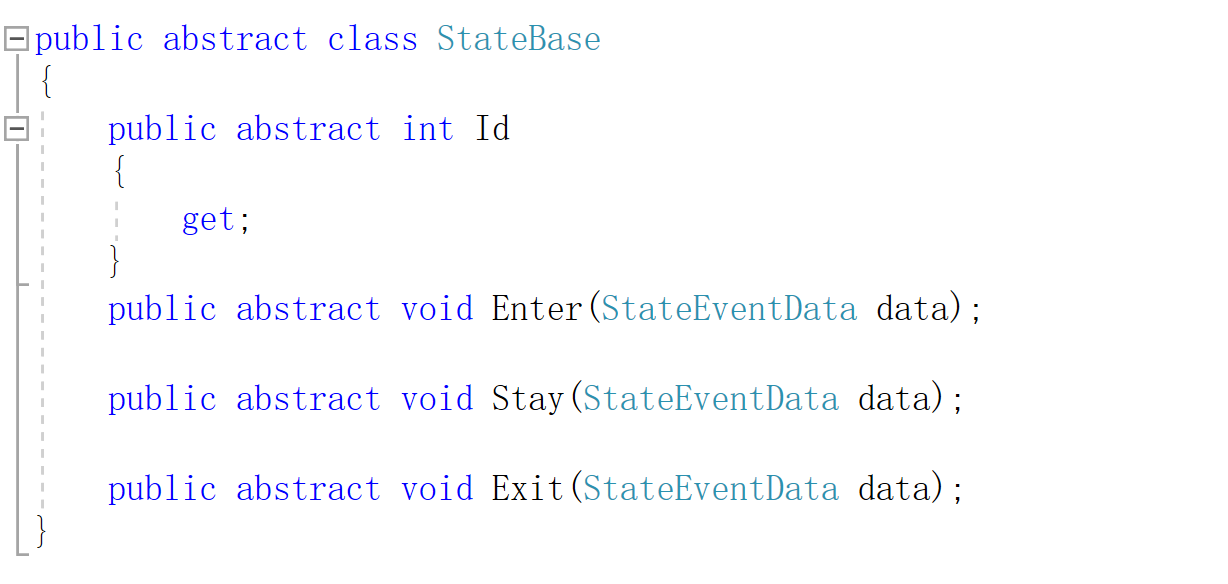 我们换状态的时候,新状态要进入,旧状态要退出,在不换状态的时候,则要一直执行当前状态,所以基类中要有三个方法,分别为进入状态,状态持续,退出状态的三个方法,为了区分不同的状态,还要有个状态的标识,可以用数字来标识当前状态是什么