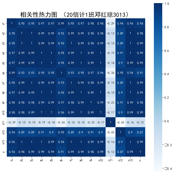 1 import numpy as np 2 import pandas as pd 3 4 inputfile = r'C:\Users\86184\Desktop\文件集\data/data.csv' # 输入的数据文件 5 data = pd.read_csv(inputfile) # 读取数据 6 7 # 描述性统计分析 8 description = [data.min(), data.max(), data.mean(), data.std()] # 依次计算最小值、最大值、均值、标准差 9 description = pd.DataFrame(description, index = ['Min', 'Max', 'Mean', 'STD']).T # 将结果存入数据框 10 print('描述性统计结果:\n',np.round(description, 2)) # 保留两位小数 11 12 13 14 # 代码6-2 15 16 # 相关性分析 17 corr = data.corr(method = 'pearson') # 计算相关系数矩阵 18 print('相关系数矩阵为:\n',np.round(corr, 2)) # 保留两位小数 19 20 21 22 # 绘制热力图 23 import matplotlib.pyplot as plt 24 import seaborn as sns 25 inputfile = r'C:\Users\86184\Desktop\文件集\data/data.csv' # 输入的数据文件 26 data = pd.read_csv(inputfile) # 读取数据 27 plt.subplots(figsize=(10, 10)) # 设置画面大小 28 sns.heatmap(corr, annot=True, vmax=1, square=True, cmap="Blues") 29 plt.rcParams['font.sans-serif'] = ['SimHei'] # 用来正常显示中文标签 30 plt.title('相关性热力图 (20信计1班邓红琼3013)',fontsize=20) 31 plt.show()