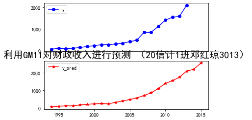 1 import sys 2 sys.path.append(r'C:\Users\86184\Desktop\文件集\data\code') # 设置路径 3 import numpy as np 4 import pandas as pd 5 from GM11 import GM11 # 引入自编的灰色预测函数 6 7 import matplotlib.pyplot as plt 8 from sklearn.svm import LinearSVR 9 10 inputfile = r'C:\Users\86184\Desktop\文件集\data\new_reg_data_GM11.xls' # 灰色预测后保存的路径 11 data = pd.read_excel(inputfile,index_col = 0,header =0) # 读取数据 12 feature = ['x1', 'x3', 'x4', 'x5', 'x6', 'x7', 'x8', 'x13'] 13 #print(data) # 属性所在列 14 data_train = data.loc[range(1994,2014)].copy() 15 print(data_train) 16 data_mean = data_train.mean() 17 data_std = data_train.std() 18 data_train = (data_train - data_mean)/data_std # 数据标准化 19 x_train = data_train[feature].values # 属性数据 20 y_train = data_train['y'].values # 标签数据 21 linearsvr = LinearSVR() # 调用LinearSVR()函数 22 linearsvr.fit(x_train,y_train) 23 x = ((data[feature] - data_mean[feature])/data_std[feature]).values # 预测,并还原结果。 24 data['y_pred'] = linearsvr.predict(x) * data_std['y'] + data_mean['y'] 25 outputfile = r'C:\Users\86184\Desktop\文件集\data\new_reg_data_GM11_revenue.xls' # SVR预测后保存的结果 26 27 28 print('真实值与预测值分别为:\n',data[['y','y_pred']]) 29 30 31 fig = data[['y','y_pred']].plot(subplots = True, style=['b-o','r-*']) # 画出预测结果图 32 plt.title('利用GM11对财政收入进行预测 (20信计1班邓红琼3013)',fontsize=20) 33 plt.show()