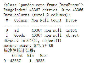1 # -*- coding: utf-8 -*- 2 3 # 代码8-1 查看数据特征 4 5 import numpy as np 6 import pandas as pd 7 8 inputfile = r'C:\Users\86184\Desktop\文件集\data\GoodsOrder.csv' # 输入的数据文件 9 data = pd.read_csv(inputfile,encoding = 'gbk') # 读取数据 10 data .info() # 查看数据属性 11 12 data = data['id'] 13 description = [data.count(),data.min(), data.max()] # 依次计算总数、最小值、最大值 14 description = pd.DataFrame(description, index = ['Count','Min', 'Max']).T # 将结果存入数据框 15 print('描述性统计结果:\n',np.round(description)) # 输出结果