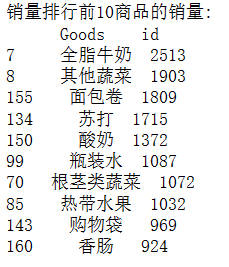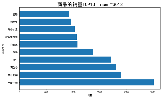 1 # 代码8-2 分析热销商品 2 3 # 销量排行前10商品的销量及其占比 4 import pandas as pd 5 inputfile = r'C:\Users\86184\Desktop\文件集\data\GoodsOrder.csv' # 输入的数据文件 6 data = pd.read_csv(inputfile,encoding = 'gbk') # 读取数据 7 group = data.groupby(['Goods']).count().reset_index() # 对商品进行分类汇总 8 sorted=group.sort_values('id',ascending=False) 9 print('销量排行前10商品的销量:\n', sorted[:10]) # 排序并查看前10位热销商品 10 11 # 画条形图展示出销量排行前10商品的销量 12 import matplotlib.pyplot as plt 13 x=sorted[:10]['Goods'] 14 y=sorted[:10]['id'] 15 plt.figure(figsize = (10, 6)) # 设置画布大小 16 plt.barh(x,y) 17 plt.rcParams['font.sans-serif'] = 'SimHei' 18 plt.xlabel('销量') # 设置x轴标题 19 plt.ylabel('商品类别') # 设置y轴标题 20 plt.title('商品的销量TOP10 num =3013',fontsize = 20) # 设置标题 21 plt.savefig(r'C:\Users\86184\Desktop\文件集\data\top10.png') # 把图片以.png格式保存 22 plt.show() # 展示图片 23 24 # 销量排行前10商品的销量占比 25 data_nums = data.shape[0] 26 for idnex, row in sorted[:10].iterrows(): 27 print(row['Goods'],row['id'],row['id']/data_nums)