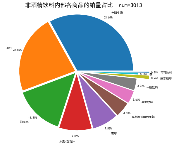 1 # 代码8-4 非酒精饮料内部商品的销量及其占比 2 3 # 先筛选“非酒精饮料”类型的商品,然后求百分比,然后输出结果到文件。 4 selected = sort_links.loc[sort_links['Types'] == '非酒精饮料'] # 挑选商品类别为“非酒精饮料”并排序 5 child_nums = selected['id'].sum() # 对所有的“非酒精饮料”求和 6 selected['child_percent'] = selected.apply(lambda line: line['id']/child_nums,axis = 1) # 求百分比 7 selected.rename(columns = {'id':'count'},inplace = True) 8 print('非酒精饮料内部商品的销量及其占比:\n',selected) 9 outfile2 = r'C:\Users\86184\Desktop\文件集\data\child_percent.csv' 10 sort_link.to_csv(outfile2,index = False,header = True,encoding='gbk') # 输出结果 11 12 # 画饼图展示非酒精饮品内部各商品的销量占比 13 import matplotlib.pyplot as plt 14 data = selected['child_percent'] 15 labels = selected['Goods'] 16 plt.figure(figsize = (10,8)) # 设置画布大小 17 explode = (0.02,0.03,0.04,0.05,0.06,0.07,0.08,0.08,0.3,0.1,0.3) # 设置每一块分割出的间隙大小 18 plt.pie(data,explode = explode,labels = labels,autopct = '%1.2f%%', 19 pctdistance = 1.1,labeldistance = 1.2) 20 plt.rcParams['font.sans-serif'] = 'SimHei' 21 plt.title("非酒精饮料内部各商品的销量占比 num=3013",fontsize=20) # 设置标题 22 plt.axis('equal') 23 plt.savefig(r'C:\Users\86184\Desktop\文件集\data\child_persent.png') # 保存图形 24 plt.show() # 展示图形