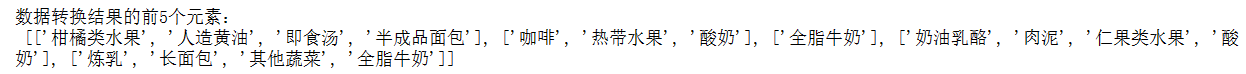 1 # -*- coding: utf-8 -*- 2 3 # 代码8-5 数据转换 4 5 import pandas as pd 6 inputfile=r'C:\Users\86184\Desktop\文件集\data\GoodsOrder.csv' 7 data = pd.read_csv(inputfile,encoding = 'gbk') 8 9 # 根据id对“Goods”列合并,并使用“,”将各商品隔开 10 data['Goods'] = data['Goods'].apply(lambda x:','+x) 11 data = data.groupby('id').sum().reset_index() 12 13 # 对合并的商品列转换数据格式 14 data['Goods'] = data['Goods'].apply(lambda x :[x[1:]]) 15 data_list = list(data['Goods']) 16 17 # 分割商品名为每个元素 18 data_translation = [] 19 for i in data_list: 20 p = i[0].split(',') 21 data_translation.append(p) 22 print('数据转换结果的前5个元素:\n', data_translation[0:5])