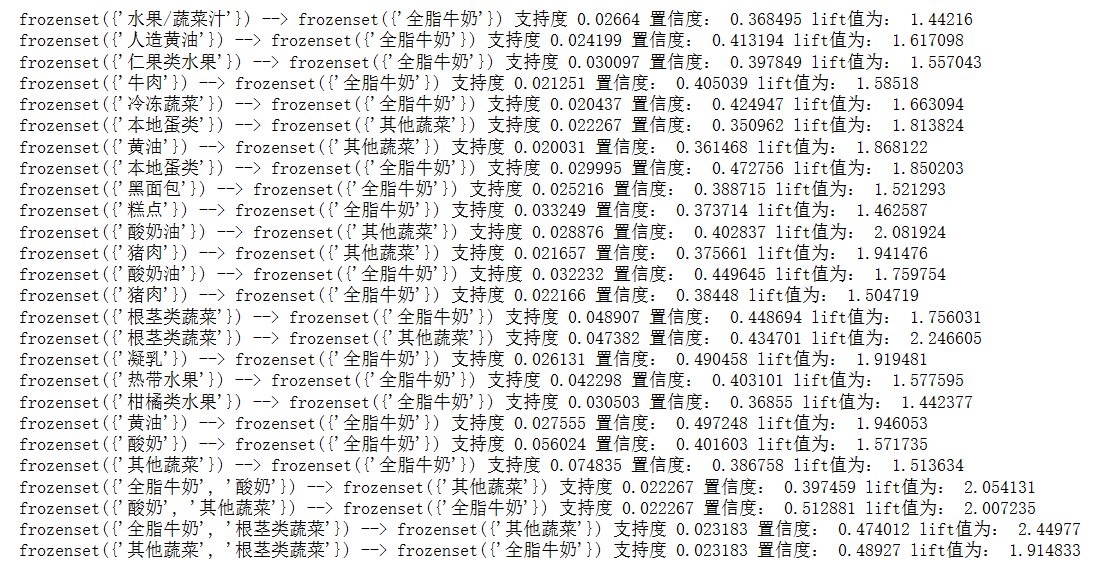 1 # 代码8-6 构建关联规则模型 2 3 from numpy import * 4 5 def loadDataSet(): 6 return [['a', 'c', 'e'], ['b', 'd'], ['b', 'c'], ['a', 'b', 'c', 'd'], ['a', 'b'], ['b', 'c'], ['a', 'b'], 7 ['a', 'b', 'c', 'e'], ['a', 'b', 'c'], ['a', 'c', 'e']] 8 9 def createC1(dataSet): 10 C1 = [] 11 for transaction in dataSet: 12 for item in transaction: 13 if not [item] in C1: 14 C1.append([item]) 15 C1.sort() 16 # 映射为frozenset唯一性的,可使用其构造字典 17 return list(map(frozenset, C1)) 18 19 # 从候选K项集到频繁K项集(支持度计算) 20 def scanD(D, Ck, minSupport): 21 ssCnt = {} 22 for tid in D: # 遍历数据集 23 for can in Ck: # 遍历候选项 24 if can.issubset(tid): # 判断候选项中是否含数据集的各项 25 if not can in ssCnt: 26 ssCnt[can] = 1 # 不含设为1 27 else: 28 ssCnt[can] += 1 # 有则计数加1 29 numItems = float(len(D)) # 数据集大小 30 retList = [] # L1初始化 31 supportData = {} # 记录候选项中各个数据的支持度 32 for key in ssCnt: 33 support = ssCnt[key] / numItems # 计算支持度 34 if support >= minSupport: 35 retList.insert(0, key) # 满足条件加入L1中 36 supportData[key] = support 37 return retList, supportData 38 39 def calSupport(D, Ck, min_support): 40 dict_sup = {} 41 for i in D: 42 for j in Ck: 43 if j.issubset(i): 44 if not j in dict_sup: 45 dict_sup[j] = 1 46 else: 47 dict_sup[j] += 1 48 sumCount = float(len(D)) 49 supportData = {} 50 relist = [] 51 for i in dict_sup: 52 temp_sup = dict_sup[i] / sumCount 53 if temp_sup >= min_support: 54 relist.append(i) 55 # 此处可设置返回全部的支持度数据(或者频繁项集的支持度数据) 56 supportData[i] = temp_sup 57 return relist, supportData 58 59 # 改进剪枝算法 60 def aprioriGen(Lk, k): 61 retList = [] 62 lenLk = len(Lk) 63 for i in range(lenLk): 64 for j in range(i + 1, lenLk): # 两两组合遍历 65 L1 = list(Lk[i])[:k - 2] 66 L2 = list(Lk[j])[:k - 2] 67 L1.sort() 68 L2.sort() 69 if L1 == L2: # 前k-1项相等,则可相乘,这样可防止重复项出现 70 # 进行剪枝(a1为k项集中的一个元素,b为它的所有k-1项子集) 71 a = Lk[i] | Lk[j] # a为frozenset()集合 72 a1 = list(a) 73 b = [] 74 # 遍历取出每一个元素,转换为set,依次从a1中剔除该元素,并加入到b中 75 for q in range(len(a1)): 76 t = [a1[q]] 77 tt = frozenset(set(a1) - set(t)) 78 b.append(tt) 79 t = 0 80 for w in b: 81 # 当b(即所有k-1项子集)都是Lk(频繁的)的子集,则保留,否则删除。 82 if w in Lk: 83 t += 1 84 if t == len(b): 85 retList.append(b[0] | b[1]) 86 return retList 87 88 def apriori(dataSet, minSupport=0.2): 89 # 前3条语句是对计算查找单个元素中的频繁项集 90 C1 = createC1(dataSet) 91 D = list(map(set, dataSet)) # 使用list()转换为列表 92 L1, supportData = calSupport(D, C1, minSupport) 93 L = [L1] # 加列表框,使得1项集为一个单独元素 94 k = 2 95 while (len(L[k - 2]) > 0): # 是否还有候选集 96 Ck = aprioriGen(L[k - 2], k) 97 Lk, supK = scanD(D, Ck, minSupport) # scan DB to get Lk 98 supportData.update(supK) # 把supk的键值对添加到supportData里 99 L.append(Lk) # L最后一个值为空集 100 k += 1 101 del L[-1] # 删除最后一个空集 102 return L, supportData # L为频繁项集,为一个列表,1,2,3项集分别为一个元素 103 104 # 生成集合的所有子集 105 def getSubset(fromList, toList): 106 for i in range(len(fromList)): 107 t = [fromList[i]] 108 tt = frozenset(set(fromList) - set(t)) 109 if not tt in toList: 110 toList.append(tt) 111 tt = list(tt) 112 if len(tt) > 1: 113 getSubset(tt, toList) 114 115 def calcConf(freqSet, H, supportData, ruleList, minConf=0.7): 116 for conseq in H: #遍历H中的所有项集并计算它们的可信度值 117 conf = supportData[freqSet] / supportData[freqSet - conseq] # 可信度计算,结合支持度数据 118 # 提升度lift计算lift = p(a & b) / p(a)*p(b) 119 lift = supportData[freqSet] / (supportData[conseq] * supportData[freqSet - conseq]) 120 121 if conf >= minConf and lift > 1: 122 print(freqSet - conseq, '-->', conseq, '支持度', round(supportData[freqSet], 6), '置信度:', round(conf, 6), 123 'lift值为:', round(lift, 6)) 124 ruleList.append((freqSet - conseq, conseq, conf)) 125 126 # 生成规则 127 def gen_rule(L, supportData, minConf = 0.7): 128 bigRuleList = [] 129 for i in range(1, len(L)): # 从二项集开始计算 130 for freqSet in L[i]: # freqSet为所有的k项集 131 # 求该三项集的所有非空子集,1项集,2项集,直到k-1项集,用H1表示,为list类型,里面为frozenset类型, 132 H1 = list(freqSet) 133 all_subset = [] 134 getSubset(H1, all_subset) # 生成所有的子集 135 calcConf(freqSet, all_subset, supportData, bigRuleList, minConf) 136 return bigRuleList 137 138 if __name__ == '__main__': 139 dataSet = data_translation 140 L, supportData = apriori(dataSet, minSupport = 0.02) 141 rule = gen_rule(L, supportData, minConf = 0.35)