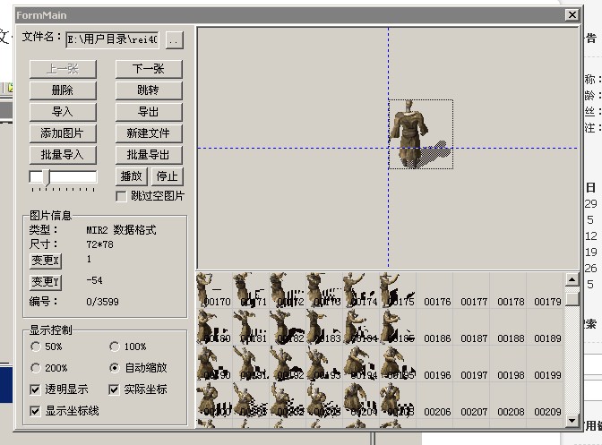 unit main; interface uses Windows, Messages, SysUtils, Variants, Classes, Graphics, Controls, Forms, Dialogs, StdCtrls, ExtCtrls, Grids, ExtDlgs, mywil, ComCtrls; type TFormMain = class(TForm) Panel1: TPanel; Label1: TLabel; edtFileName: TEdit; btnLoadFile: TButton; btnUp: TButton; btnDown: TButton; btnDel: TButton; btnJump: TButton; btnPlay: TButton; btnStop: TButton; btnInput: TButton; btnOutput: TButton; btnAddPic: TButton; btnCreate: TButton; btnBatchInput: TButton; btnBatchOut: TButton; GroupBox1: TGroupBox; Label2: TLabel; btnX: TButton; btnY: TButton; Label3: TLabel; Label4: TLabel; GroupBox2: TGroupBox; rb50: TRadioButton; rb100: TRadioButton; rb200: TRadioButton; rbAutoZoom: TRadioButton; chkTransparent: TCheckBox; chkRealXY: TCheckBox; chkCoordinate: TCheckBox; Panel2: TPanel; Panel3: TPanel; DrawGrid1: TDrawGrid; Panel4: TPanel; ScrollBox1: TScrollBox; lblType: TLabel; lblSize: TLabel; lblX: TLabel; lblY: TLabel; lblIndex: TLabel; OpenDialog1: TOpenDialog; SaveDialog1: TSaveDialog; OpenPictureDialog1: TOpenPictureDialog; SavePictureDialog1: TSavePictureDialog; pbShow: TPaintBox; tmrPlay: TTimer; trckbrPlayInteval: TTrackBar; chkJump: TCheckBox; procedure FormCreate(Sender: TObject); procedure FormPaint(Sender: TObject); procedure pbShowPaint(Sender: TObject); procedure btnLoadFileClick(Sender: TObject); procedure DrawGrid1DrawCell(Sender: TObject; ACol, ARow: Integer; Rect: TRect; State: TGridDrawState); procedure btnPlayClick(Sender: TObject); procedure tmrPlayTimer(Sender: TObject); procedure btnStopClick(Sender: TObject); procedure btnUpClick(Sender: TObject); procedure btnDownClick(Sender: TObject); procedure trckbrPlayIntevalChange(Sender: TObject); procedure btnJumpClick(Sender: TObject); procedure btnInputClick(Sender: TObject); procedure btnOutputClick(Sender: TObject); procedure btnBatchOutClick(Sender: TObject); procedure btnDelClick(Sender: TObject); private { Private declarations } procedure FillInfo(Index: Integer); public { Public declarations } end; const PLAYINTERVAL = 20; var FormMain: TFormMain; MainBitMap: TBitmap; BmpIndex, BmpWidth, BmpHeight: Integer; BmpX, BmpY: Integer; BmpZoom: Real; BmpTransparent, Stop, DrawYes: Boolean; Wil: TWIL; implementation {$R *.dfm} uses OutPic; procedure TFormMain.FormCreate(Sender: TObject); begin Wil := TWIL.Create(self); DrawYes := True; trckbrPlayInteval.Position := 3; BmpIndex := 0; tmrPlay.Interval := trckbrPlayInteval.Position * PLAYINTERVAL; pbShow.Width := ScrollBox1.Width - 5; pbShow.Height := ScrollBox1.Height - 5; end; procedure TFormMain.FormPaint(Sender: TObject); begin pbShow.Refresh; end; procedure TFormMain.pbShowPaint(Sender: TObject); begin if Wil.Stream <> nil then Wil.DrawZoom(pbShow.Canvas, BmpX, BmpY, BmpIndex, BmpZoom, BmpTransparent,False); if chkCoordinate.Checked then begin pbShow.Canvas.Pen.Style := psDot; pbShow.canvas.Pen.Color := clBlue; pbShow.Canvas.MoveTo(0, pbShow.Height div 2); pbShow.Canvas.LineTo(pbShow.Width, pbShow.Height div 2); pbShow.Canvas.MoveTo(pbShow.Width div 2, 0); pbShow.Canvas.LineTo(pbShow.Width div 2, pbShow.Height); end; end; procedure TFormMain.btnLoadFileClick(Sender: TObject); begin if OpenDialog1.Execute then begin edtFileName.Text := OpenDialog1.FileName; if FileExists(edtFileName.text) then begin if Wil.Stream <> nil then Wil.Finalize; Wil.FileName := edtFileName.Text; Wil.Initialize; if Wil.Stream = nil then begin ShowMessage('WIL文件错误'); Exit; end; BmpIndex := 0; DrawGrid1.RowCount := (Wil.ImageCount div 10) + 1; DrawGrid1.Refresh; FillInfo(BmpIndex); end; end; end; procedure TFormMain.FillInfo(Index: Integer); var Width1, Height1: Integer; Zoom, Zoom1: Real; begin Zoom := 1; Zoom1 := 1; BmpZoom := 1; if Wil.Stream <> nil then begin BmpIndex := Index; BmpTransparent := chkTransparent.Checked; MainBitMap := Wil.Bitmaps[Index]; Width1 := Wil.Width; Height1 := Wil.Height; if (not Stop) and chkJump.Checked then //跳过空图片 begin while ((Width1 <= 1) or (Height1 <= 1)) and (BmpIndex < Wil.ImageCount - 1) do begin Inc(BmpIndex); Width1 := Wil.Bitmaps[BmpIndex].Width; Height1 := Wil.Bitmaps[BmpIndex].Height; end; end; // 设置BMPX,Y 值,图片在画框中的起始位置 if rbAutoZoom.Checked then //自动大小 begin if (Width1 < pbShow.Width) and (Height1 < pbShow.Height) then begin BmpZoom := 1; //小于画框图片缩放比例为1 pbShow.Width := ScrollBox1.Width; pbShow.Height := ScrollBox1.Height; if chkRealXY.Checked then //显示坐标线 begin BmpX := pbShow.Width div 2 + Wil.px; //加上偏移坐标 BmpY := pbShow.Height div 2 + Wil.py; end else begin BmpX := pbShow.Width div 2; BmpY := pbShow.Height div 2; end; end else begin //图片大于画框, pbShow.Width := ScrollBox1.Width; pbShow.Height := ScrollBox1.Height; if Width1 > pbShow.Width then Zoom := Width1 / pbShow.Width; if Height1 > pbShow.Height then Zoom1 := Height1 / pbShow.Height; if Zoom > Zoom1 then //选择缩小比例大的值 BmpZoom := Zoom else BmpZoom := Zoom1; BmpX := 1; BmpY := 1; end; end else begin //选择缩放比例 if rb50.Checked then BmpZoom := 0.5; if rb100.Checked then BmpZoom := 1.0; if rb200.Checked then BmpZoom := 2.0; BmpX := 1; BmpY := 1; pbShow.Width := ScrollBox1.Width; pbShow.Height := ScrollBox1.Height; Width1 := Round(Width1 * BmpZoom); //取整 Height1 := Round(Height1 * BmpZoom); if (Width1 < pbShow.Width) and //缩放后的图片小于画框 (Height1 < pbShow.Height) then begin if chkRealXY.Checked then //显示坐标线 begin BmpX := pbShow.Width div 2 + Wil.px; BmpY := pbShow.Height div 2 + Wil.py; end else begin BmpX := (pbShow.Width - Width1) div 2; BmpY := (pbShow.Height - height1) div 2; end; end else begin //图片超出设定画框大小的时候将画框大小设为图片大小? pbShow.Width := Width1 * 2; pbShow.Height := Height1 * 2; end; end; lblX.Caption := IntToStr(Wil.px); lblY.Caption := IntToStr(Wil.py); lblSize.Caption := IntToStr(Width1) + '*' + IntToStr(Height1); //imagecount 是从0开始计算? lblIndex.Caption := IntToStr(Index) + '