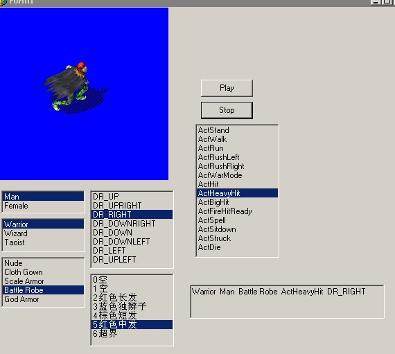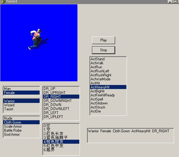 unit Movies; interface uses Windows, Messages, SysUtils, Variants, Classes, Graphics, Controls, Forms, Dialogs, ExtCtrls, StdCtrls, DXDraws, WILIB; type TAction = (ActStand, ActWalk, ActRun, ActRushLeft, ActRushRight, ActWarMode, ActHit, ActHeavyHit, ActBigHit, ActFireHitReady, ActSpell, ActSitdown, ActStruck, ActDie); TActionInfo = packed record start: Word; frame: Word; skip: Word; ftime: Word; usetick: Word; end; THumanAction = packed record ActStand: TActionInfo; ActWalk: TActionInfo; ActRun: TActionInfo; ActRushLeft: TActionInfo; ActRushRight: TActionInfo; ActWarMode: TActionInfo; ActHit: TActionInfo; ActHeavyHit: TActionInfo; ActBigHit: TActionInfo; ActFireHitReady: TActionInfo; ActSpell: TActionInfo; ActSitdown: TActionInfo; ActStruck: TActionInfo; ActDie: TActionInfo; end; TForm1 = class(TForm) DXDrawHuman: TDXDraw; ButtonPlay: TButton; TimerShow: TTimer; ListBoxAction: TListBox; ListBoxDirect: TListBox; ListBoxSex: TListBox; ListBoxJob: TListBox; ListBoxDress: TListBox; MemoResult: TMemo; ButtonStop: TButton; ListBoxHair: TListBox; procedure FormCreate(Sender: TObject); procedure FormDestroy(Sender: TObject); procedure DXDrawHumanInitialize(Sender: TObject); procedure ButtonPlayClick(Sender: TObject); procedure TimerShowTimer(Sender: TObject); procedure PlayScence(MSurface: TDirectDrawSurface); procedure ButtonStopClick(Sender: TObject); private { Private declarations } public { Public declarations } end; const HUMANFRAME = 600; DR_UP = 0; DR_UPRIGHT = 1; DR_RIGHT = 2; DR_DOWNRIGHT = 3; DR_DOWN = 4; DR_DOWNLEFT = 5; DR_LEFT = 6; DR_UPLEFT = 7; HA: THumanAction = ( ActStand: (start: 0; frame: 4; skip: 4; ftime: 200; usetick: 0); ActWalk: (start: 64; frame: 6; skip: 2; ftime: 180; usetick: 2); ActRun: (start: 128; frame: 6; skip: 2; ftime: 200; usetick: 3); ActRushLeft: (start: 128; frame: 3; skip: 5; ftime: 200; usetick: 3); //先左手 ActRushRight: (start: 131; frame: 3; skip: 5; ftime: 200; usetick: 3); //先右手 ActWarMode: (start: 192; frame: 1; skip: 0; ftime: 200; usetick: 0); //ActHit: (start: 200; frame: 5; skip: 3; ftime: 140; usetick: 0); ActHit: (start: 200; frame: 6; skip: 2; ftime: 140; usetick: 0); ActHeavyHit: (start: 264; frame: 6; skip: 2; ftime: 140; usetick: 0); ActBigHit: (start: 328; frame: 8; skip: 0; ftime: 120; usetick: 0); //这里指的烈火蓄力的动作? ActFireHitReady: (start: 192; frame: 1; skip: 0; ftime: 140; usetick: 0); ActSpell: (start: 392; frame: 6; skip: 2; ftime: 200; usetick: 0); ActSitdown: (start: 456; frame: 2; skip: 0; ftime: 240; usetick: 0); ActStruck: (start: 472; frame: 3; skip: 5; ftime: 140; usetick: 0); ActDie: (start: 536; frame: 4; skip: 4; ftime: 200; usetick: 0) ); type TActor = class m_btSex: Byte; m_btJob: Byte; m_btDress: Byte; m_btDir: Byte; m_btAtc: TAction; m_nStartFrame: Integer; m_nEndFrame: Integer; m_dwFrameTime: LongWord; m_dwStartTime: LongWord; m_nMaxTick: Integer; m_nCurTick: Integer; m_nCurrentFrame: Integer; m_BodySurface: TDirectDrawSurface; m_nPx: Integer; m_nPy: Integer; m_btHair : Byte; m_nHairOffset: Integer; m_HairSurface: TDirectDrawSurface; m_nHairPx: Integer; m_nHairPy: Integer; constructor Create; destructor Destroy; procedure CalcActorFrame; procedure Run; procedure LoadSurface; procedure DrawChr(dsurface: TDirectDrawSurface; dx, dy: integer); end; var Form1: TForm1; Actor1: TActor; g_mainWil: TWILImages; g_WHumImgImages: TWILImages; g_WHairImgImages: TWILImages; g_cacheSurface: TDirectDrawSurface; bmpIndex: Integer; movetick: Boolean; m_dwMoveTime: LongWord; implementation {$R *.dfm} function ToDXD7Color(Color: TColor): TColor; var R, G, B: Integer; begin R := Color and $FF; G := (Color and $FF00) shr 8; B := (Color and $FF0000) shr 16; Result := R shl 16 or G shl 8 or B; end; procedure TForm1.FormCreate(Sender: TObject); begin TimerShow.Enabled := False; bmpIndex := -1; ListBoxJob.ItemIndex := 0; ListBoxSex.ItemIndex := 0; ListBoxDress.ItemIndex := 0; ListBoxAction.ItemIndex := 0; ListBoxDirect.ItemIndex := 0; g_WHumImgImages := TWILImages.Create; g_WHairImgImages := TWILImages.Create; Actor1 := TActor.Create; end; procedure TForm1.FormDestroy(Sender: TObject); begin g_WHumImgImages.Destroy; g_WHairImgImages.Destroy; g_cacheSurface.Free; Actor1.Destroy; end; procedure TForm1.DXDrawHumanInitialize(Sender: TObject); begin g_WHumImgImages.DDraw := DXDrawHuman.DDraw; g_WHumImgImages.FileName := 'E:\mirClient\Mir1.76\Data\Hum.wil'; g_WHumImgImages.Initialize; g_WHairImgImages.DDraw := DXDrawHuman.DDraw; g_WHairImgImages.FileName := 'E:\mirClient\Mir1.76\Data\Hair.wil'; g_WHairImgImages.Initialize; end; procedure TForm1.ButtonPlayClick(Sender: TObject); begin TimerShow.Enabled := True; MemoResult.Text := ListBoxJob.Items[ListBoxJob.ItemIndex] + ' ' + ListBoxSex.Items[ListBoxSex.ItemIndex] + ' ' + ListBoxDress.Items[ListBoxDress.ItemIndex] + ' ' + ListBoxAction.Items[ListBoxAction.ItemIndex] + ' ' + ListBoxDirect.Items[ListBoxDirect.ItemIndex]; case ListBoxSex.ItemIndex of 0: Actor1.m_btSex := 0; 1: Actor1.m_btSex := 1; else Actor1.m_btSex := 0; end; case ListBoxJob.ItemIndex of 0: Actor1.m_btJob := 0; 1: Actor1.m_btJob := 1; 2: Actor1.m_btJob := 2; else Actor1.m_btJob := 0; end; case ListBoxDress.ItemIndex of 0: Actor1.m_btDress := 0; 1: Actor1.m_btDress := 1; 2: Actor1.m_btDress := 2; 3: begin case ListBoxJob.ItemIndex of 0: Actor1.m_btDress := 3; 1: Actor1.m_btDress := 4; 2: Actor1.m_btDress := 5; else Actor1.m_btDress := 0; end; end; 4: begin case ListBoxJob.ItemIndex of 0: Actor1.m_btDress := 6; 1: Actor1.m_btDress := 7; 2: Actor1.m_btDress := 8; else Actor1.m_btDress := 0; end; end; else Actor1.m_btDress := 0; end; case ListBoxAction.ItemIndex of 0: Actor1.m_btAtc := ActStand; 1: Actor1.m_btAtc := ActWalk; 2: Actor1.m_btAtc := ActRun; 3: Actor1.m_btAtc := ActRushLeft; 4: Actor1.m_btAtc := ActRushRight; 5: Actor1.m_btAtc := ActWarMode; 6: Actor1.m_btAtc := ActHit; 7: Actor1.m_btAtc := ActHeavyHit; 8: Actor1.m_btAtc := ActBigHit; 9: Actor1.m_btAtc := ActFireHitReady; 10: Actor1.m_btAtc := ActSp