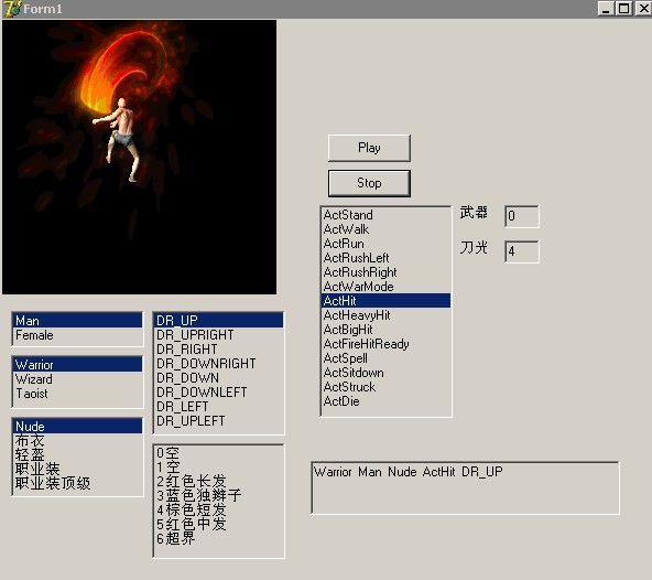 unit Movies; interface uses Windows, Messages, SysUtils, Variants, Classes, Graphics, Controls, Forms, Dialogs, ExtCtrls, StdCtrls, DXDraws, WILIB; type TAction = (ActStand, ActWalk, ActRun, ActRushLeft, ActRushRight, ActWarMode, ActHit, ActHeavyHit, ActBigHit, ActFireHitReady, ActSpell, ActSitdown, ActStruck, ActDie); TActionInfo = packed record start: Word; frame: Word; skip: Word; ftime: Word; usetick: Word; end; THumanAction = packed record ActStand: TActionInfo; ActWalk: TActionInfo; ActRun: TActionInfo; ActRushLeft: TActionInfo; ActRushRight: TActionInfo; ActWarMode: TActionInfo; ActHit: TActionInfo; ActHeavyHit: TActionInfo; ActBigHit: TActionInfo; ActFireHitReady: TActionInfo; ActSpell: TActionInfo; ActSitdown: TActionInfo; ActStruck: TActionInfo; ActDie: TActionInfo; end; TForm1 = class(TForm) DXDrawHuman: TDXDraw; ButtonPlay: TButton; TimerShow: TTimer; ListBoxAction: TListBox; ListBoxDirect: TListBox; ListBoxSex: TListBox; ListBoxJob: TListBox; ListBoxDress: TListBox; MemoResult: TMemo; ButtonStop: TButton; ListBoxHair: TListBox; Edit1: TEdit; Label1: TLabel; Edit2: TEdit; Label2: TLabel; procedure FormCreate(Sender: TObject); procedure FormDestroy(Sender: TObject); procedure DXDrawHumanInitialize(Sender: TObject); procedure ButtonPlayClick(Sender: TObject); procedure TimerShowTimer(Sender: TObject); procedure PlayScence(MSurface: TDirectDrawSurface); procedure ButtonStopClick(Sender: TObject); procedure GetEffectBase(mag: integer; var wimg: TWILImages; var idx: integer); private { Private declarations } public { Public declarations } end; const HUMANFRAME = 600; DR_UP = 0; DR_UPRIGHT = 1; DR_RIGHT = 2; DR_DOWNRIGHT = 3; DR_DOWN = 4; DR_DOWNLEFT = 5; DR_LEFT = 6; DR_UPLEFT = 7; HA: THumanAction = ( ActStand: (start: 0; frame: 4; skip: 4; ftime: 200; usetick: 0); ActWalk: (start: 64; frame: 6; skip: 2; ftime: 180; usetick: 2); ActRun: (start: 128; frame: 6; skip: 2; ftime: 200; usetick: 3); ActRushLeft: (start: 128; frame: 3; skip: 5; ftime: 200; usetick: 3); //先左手 ActRushRight: (start: 131; frame: 3; skip: 5; ftime: 200; usetick: 3); //先右手 ActWarMode: (start: 192; frame: 1; skip: 0; ftime: 200; usetick: 0); //ActHit: (start: 200; frame: 5; skip: 3; ftime: 140; usetick: 0); ActHit: (start: 200; frame: 6; skip: 2; ftime: 140; usetick: 0); ActHeavyHit: (start: 264; frame: 6; skip: 2; ftime: 140; usetick: 0); ActBigHit: (start: 328; frame: 8; skip: 0; ftime: 120; usetick: 0); //这里指的烈火蓄力的动作? ActFireHitReady: (start: 192; frame: 1; skip: 0; ftime: 140; usetick: 0); ActSpell: (start: 392; frame: 6; skip: 2; ftime: 200; usetick: 0); ActSitdown: (start: 456; frame: 2; skip: 0; ftime: 240; usetick: 0); ActStruck: (start: 472; frame: 3; skip: 5; ftime: 140; usetick: 0); ActDie: (start: 536; frame: 4; skip: 4; ftime: 200; usetick: 0) ); //一个人物模型就是599张图片 WORDER: array[0..1, 0..599] of byte = (//男女角色有些不同? ( //站立0-63 0, 0, 0, 0, 0, 0, 0, 0, 1, 1, 1, 1, 1, 1, 1, 1, 1, 1, 1, 1, 1, 1, 1, 1, 1, 1, 1, 1, 1, 1, 1, 1, 0, 0, 0, 0, 0, 0, 0, 0, 0, 0, 0, 0, 1, 1, 1, 1, 0, 0, 0, 0, 1, 1, 1, 1, 0, 0, 0, 0, 1, 1, 1, 1, //走64-127 0, 0, 0, 0, 0, 0, 0, 0, 1, 1, 1, 1, 1, 1, 1, 1, 1, 1, 1, 1, 1, 1, 1, 1, 1, 1, 1, 1, 1, 1, 1, 1, 0, 0, 0, 0, 0, 0, 0, 0, 0, 0, 0, 0, 0, 0, 0, 1, 0, 0, 0, 0, 0, 0, 0, 1, 0, 0, 0, 0, 0, 0, 0, 1, //跑128-191 0, 0, 0, 0, 0, 0, 0, 0, 1, 1, 1, 1, 1, 1, 1, 1, 1, 1, 1, 1, 1, 1, 1, 1, 1, 1, 1, 1, 1, 1, 1, 1, 0, 0, 1, 1, 1, 1, 1, 1, 0, 0, 1, 1, 1, 0, 0, 1, 0, 0, 0, 0, 0, 0, 0, 1, 0, 0, 0, 0, 0, 0, 0, 1, //战斗准备 8个方向,192-199 0, 1, 1, 1, 0, 0, 0, 0, //攻击动作Hit 200-263 1, 1, 1, 0, 0, 0, 1, 1, 1, 1, 1, 0, 0, 0, 0, 0, 1, 1, 1, 0, 0, 0, 0, 0, 1, 1, 1, 1, 1, 1, 1, 1, 1, 1, 1, 1, 1, 1, 1, 1, 1, 1, 1, 0, 0, 0, 0, 0, 0, 0, 0, 0, 0, 0, 0, 0, 1, 1, 1, 1, 0, 0, 1, 1, //攻击动作HeavyHit 264 - 327 0, 1, 1, 0, 0, 0, 1, 1, 0, 1, 1, 0, 0, 0, 1, 1, 1, 1, 1, 0, 0, 0, 0, 0, 1, 1, 1, 0, 0, 1, 1, 1, 1, 1, 1, 1, 1, 1, 1, 1, 0, 1, 1, 1, 1, 1, 1, 1, 0, 0, 0, 1, 1, 1, 0, 0, 0, 1, 1, 1, 1, 0, 1, 1, //攻击动作BigHit 328- 391 1, 1, 0, 1, 0, 0, 0, 0, 1, 1, 0, 0, 0, 0, 0, 0, 1, 1, 1, 1, 1, 0, 0, 0, 1, 1, 0, 0, 1, 0, 0, 0, 1, 1, 1, 0, 0, 0, 0, 1, 0, 1, 1, 0, 0, 0, 0, 0, 0, 0, 0, 0, 1, 1, 1, 0, 1, 1, 1, 1, 1, 0, 0, 0, //魔法攻击动作Spell 392- 455 0, 0, 0, 0, 0, 0, 1, 1, 0, 0, 0, 0, 0, 0, 1, 1, 0, 0, 0, 0, 0, 0, 1, 1, 1, 0, 0, 0, 0, 1, 1, 1, 1, 1, 1, 1, 1, 1, 1, 1, 0, 1, 1, 1, 1, 1, 1, 1, 0, 0, 1, 1, 0, 0, 1, 1, 0, 0, 0, 1, 0, 0, 1, 1, //挖,蹲下的动作Sitdown 每个方向2帧 456-471 0, 0, 1, 0, 1, 1, 1, 1, 1, 1, 0, 0, 0, 1, 0, 0, //被攻击后仰的动作Struck 每个方向3帧 472- 535 0, 0, 0, 1, 1, 1, 1, 1, 1, 1, 1, 1, 1, 1, 1, 1, 1, 1, 1, 1, 1, 1, 1, 1, 1, 1, 1, 1, 1, 1, 1, 1, 0, 0, 0, 1, 1, 1, 1, 1, 0, 0, 0, 1, 1, 1, 1, 1, 0, 0, 0, 1, 1, 1, 1, 1, 0, 0, 0, 1, 1, 1, 1, 1, //死亡的动作 每个方向4帧 536-599 0, 0, 1, 1, 1, 1, 1, 1, 0, 1, 1, 1, 1, 1, 1, 1, 1, 1, 1, 1, 1, 1, 1, 1, 1, 1, 1, 1, 1, 1, 1, 1, 0, 0, 0, 1, 1, 1, 1, 1, 0, 0, 0, 1, 1, 1, 1, 1, 0, 0, 0, 1, 1, 1, 1, 1, 0, 0, 0, 1, 1, 1, 1, 1 ), ( //站立0-63 0, 0, 0, 0, 0, 0, 0, 0, 1, 1, 1, 1, 1, 1, 1, 1, 1, 1, 1, 1, 1, 1, 1, 1, 1, 1, 1, 1, 1, 1, 1, 1, 0, 0, 0, 0, 0, 0, 0, 0, 0, 0, 0, 0, 1, 1, 1, 1, 0, 0, 0, 0, 1, 1, 1, 1, 0, 0, 0, 0, 1, 1, 1, 1, //走64-127 0, 0, 0, 0, 0, 0, 0, 0, 1, 1, 1, 1, 1, 1, 1, 1, 1, 1, 1, 1, 1, 1, 1, 1, 1, 1, 1, 1, 1, 1, 1, 1, 0, 0, 0, 0, 0, 0, 0, 0, 0, 0, 0, 0, 0, 0, 0, 1, 0, 0, 0, 0, 0, 0, 0, 1, 0, 0, 0, 0, 0, 0, 0, 1, //跑128-191 0, 0, 0, 0, 0, 0, 0, 0, 1, 1, 1, 1, 1, 1, 1, 1, 1, 1, 1, 1, 1, 1, 1, 1, 1, 1, 1, 1, 1, 1, 1, 1, 0, 0, 1, 1, 1, 1, 1, 1, 0, 0, 1, 1, 1, 0, 0, 1, 0, 0, 0, 0, 0, 0, 0, 1, 0, 0, 0, 0, 0, 0, 0, 1, //战斗准备 8个方向,192-199 1, 1, 1, 1, 0, 0, 0, 0, //攻击动作Hit 200-263 1, 1, 1, 0, 0, 0, 1, 1, 1, 1, 1, 0, 0, 0, 0, 0, 1, 1, 1, 0, 0, 0, 0, 0, 1, 1, 1, 1, 1, 1, 1, 1, 1, 1, 1, 1, 1, 1, 1, 1, 1, 1, 1, 0, 0, 0, 0, 0, 0, 0, 0, 0, 0, 0, 0, 0, 1, 1, 1, 1, 0, 0, 1, 1, //攻击动作HeavyHit 264