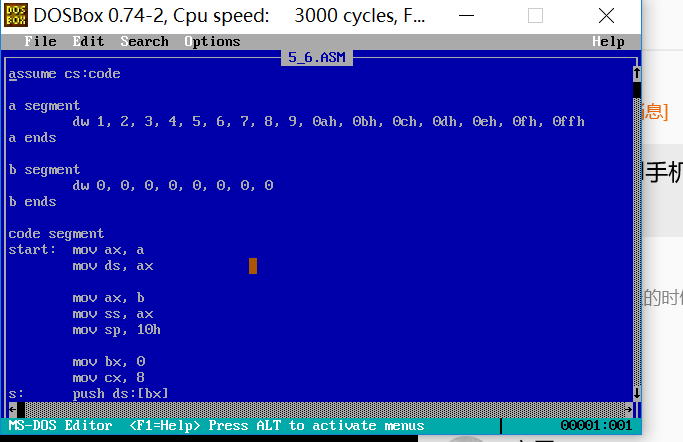 - cpu执行程序,程序返回前,cs=004h, ss=076bh, ds=076ah