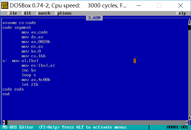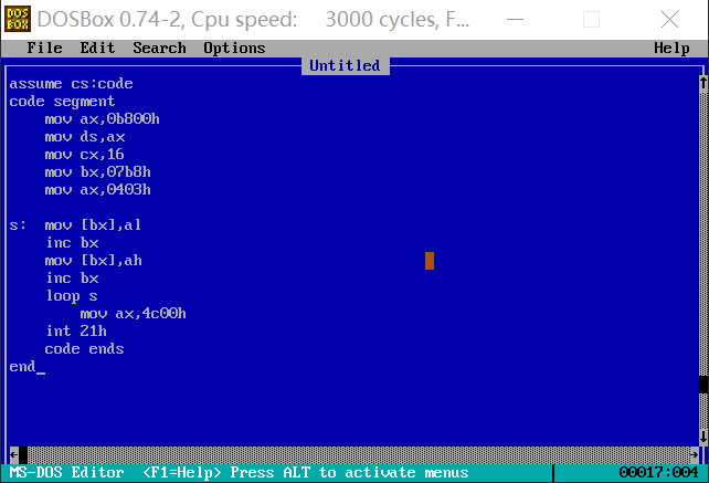 一、综合使用 loop,[bx],编写完整汇编程序,实现向内存 b800:07b8 开始的连续 16 个 字单元重复填充字数据 0403H。
