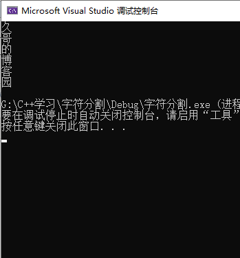 int main() { char array[100] = "久,哥,的,博,客,园"; int num = 0; char** str = new char*; str = stringCut(array, ',', num); for (int i = 0; i < num; i++) { cout << str[i] << endl; } for (int i = 0; i < num; i++)