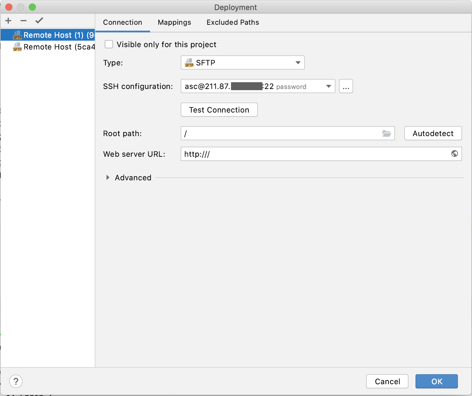 在Tools->Deployment->Configuration中配置好SSH连接信息,同时选择通过SFTP进行文件传输。