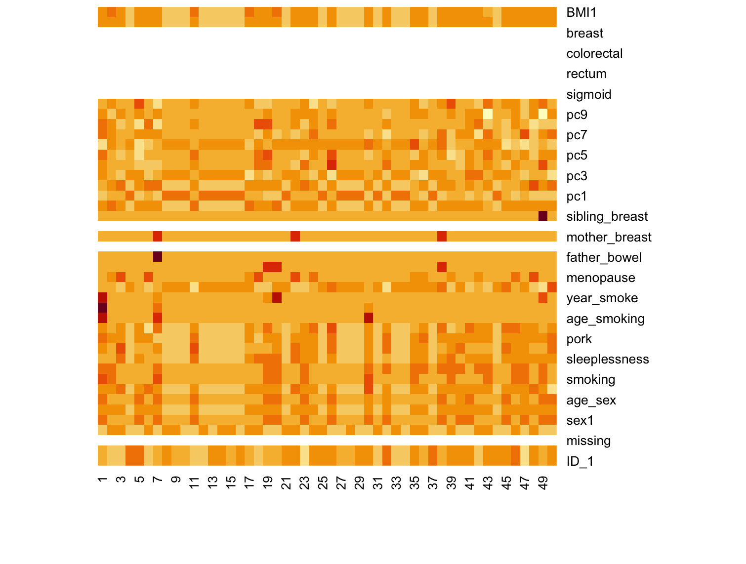 列名的中间是以.分隔开的,所以先用strsplit将其分隔成列表,f函数是将数据每行按照空格分隔开来,下面lapply方法将数据f函数应用到整个data列表。接下来将其转化成矩阵,然后将每一项单独提出来建立列表,最后从中抽取不重复的50项作为可视化的数据,然后通过heatmap函数生成可视化图片。