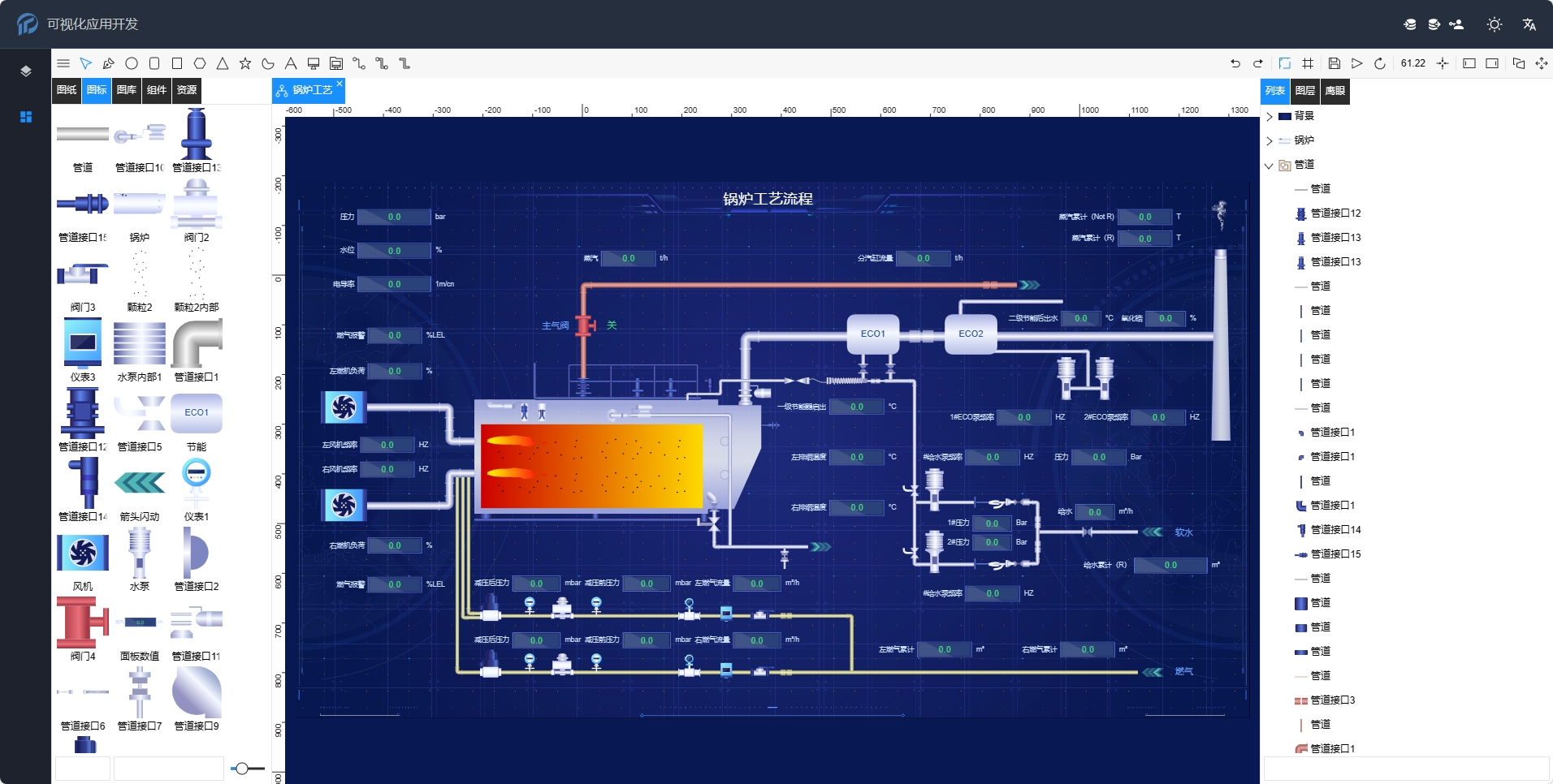 提供基于 HTML5 的图形组态编辑器,通过拖拉拽方式即可快速制作组态监控画面,满足工业场景图形图表组态监控需求。