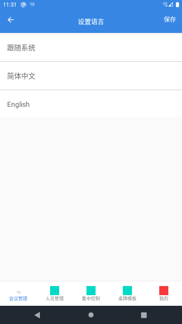 在简体中文状态:底部导航栏第一个item的文字为“会议管理”