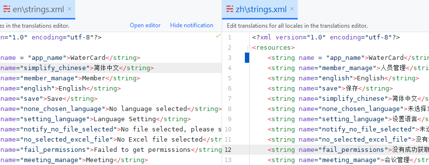 一般来说,系统自带的values包内的strings中定义的字符串,需要同步地在其他所有的values包的strings中对相应id的字符串做出对应的语言解释,否则多语言切换后会有找不到对应语言解释的情况出现。如下图:
