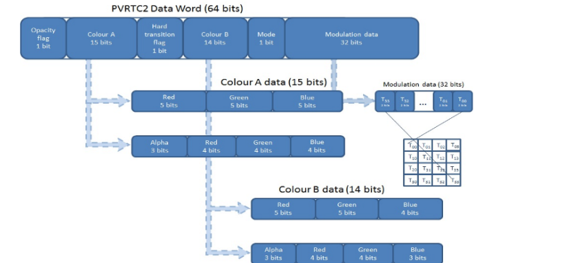 2 bits per pixel,每个像素2位,质量较差,把一个8×4的像素单元组压成一个64位的数据块。每个数据块中存储了6个变量:调制数据(32位),punch-through Alpha标志(1位),颜色A(15位),颜色A不透明标志(1位),颜色B(14位)和颜色B的不透明标志(1位)。
