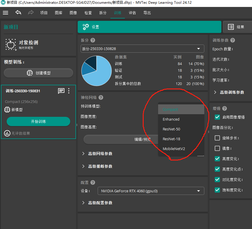 预训练模型指的就是你用哪个神经网络模型去训练,模型资源的话都在halcon官方demo的路径下存有,这里用Compact,其他的你们也可以自己试试哦,不过目前最优秀的应该还是YOLO模型。