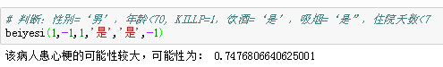 # 用贝叶斯模型判断病人属于哪种病:性别=‘男’,年龄<70, KILLP=1,饮酒=‘是’,吸烟=‘是”,住院天数<7