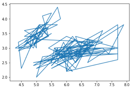 import matplotlib.pyplot as plt plt.plot(iris.data[:,0],iris.data[:,1]) plt.show()