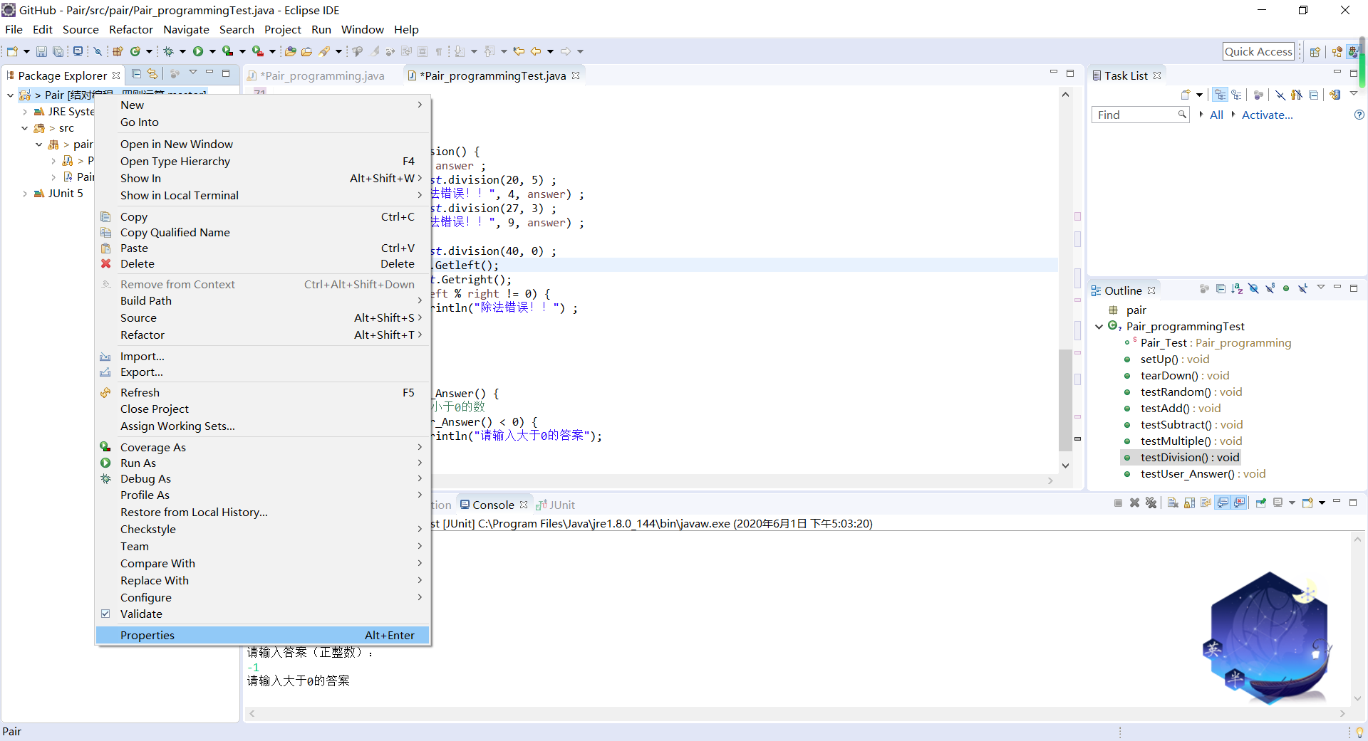 answer = Pair_Test.division(30, 9) ; left = Pair_Test.Getleft(); right = Pair_Test.Getright(); if(left/right != 3) { assertTrue("除法错误!!", answer != 3); } answer = Pair_Test.division(71, 30) ; left = Pair_Test.Getleft(); right = Pair_Test.Getright(); if(left/right != 2) { assertTrue("除法错误!!", answer != 2); }