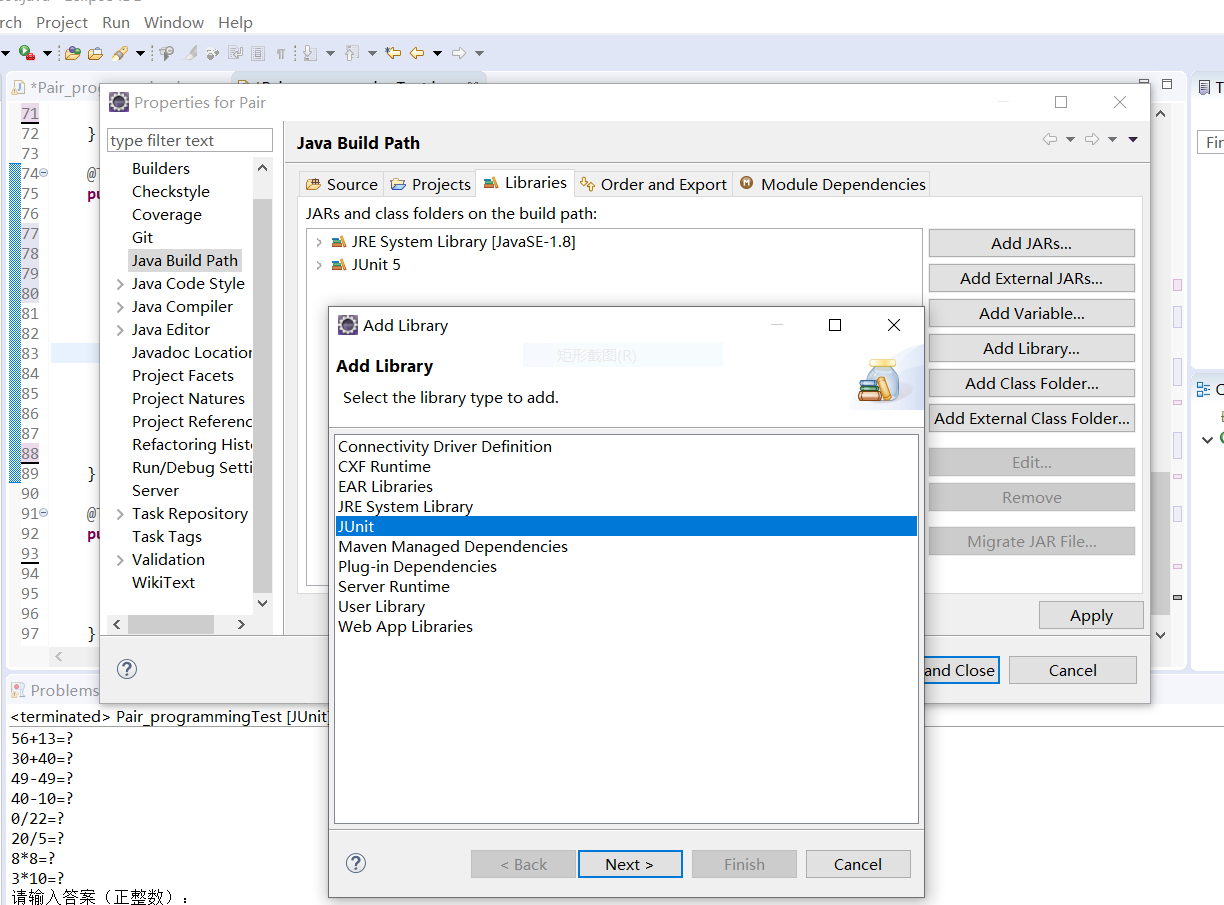 我输入了A,发现JUnit结果出现了一个Error,因为输入格式应为int型(nextInt())。