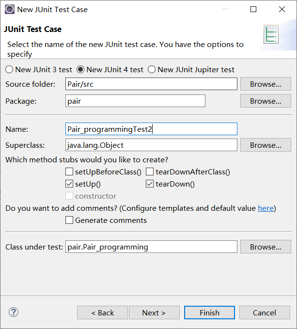 (6)选择New JUnit 4 test,create setUp()和tearDown(),然后Finish即可创建完成。