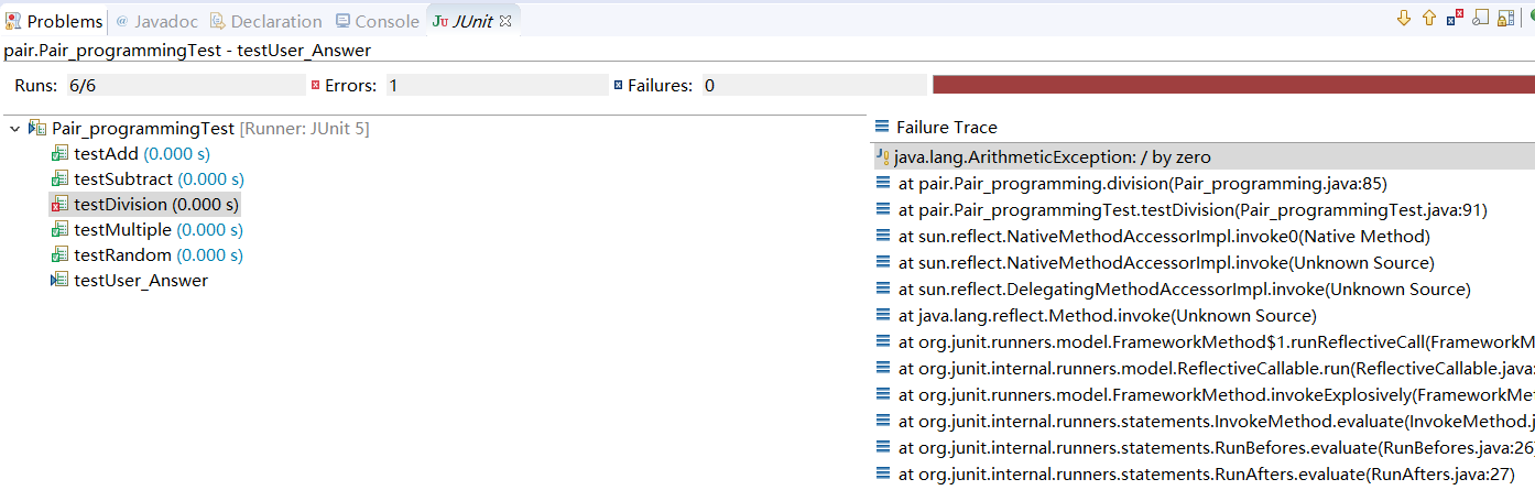 我们发现JUnit结果出现了一个Error,除数不能为0。