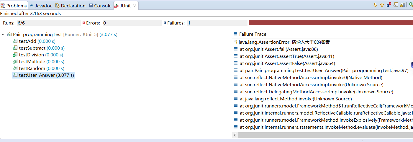 我输入了-1,发现JUnit结果出现了一个Failure,结果必须为正数。