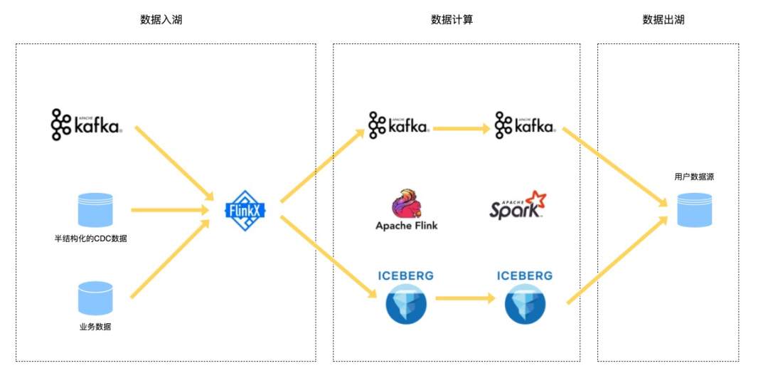 结构化、半结构化及非结构化的数据通过FlinkX做ETL处理后写入Iceberg数据湖或者写回消息队列。接着数据在消息队列和数据湖中通过Flink和Spark引擎不断流转与计算,最终写到Kudu、HBase等高效读写的数据源。
