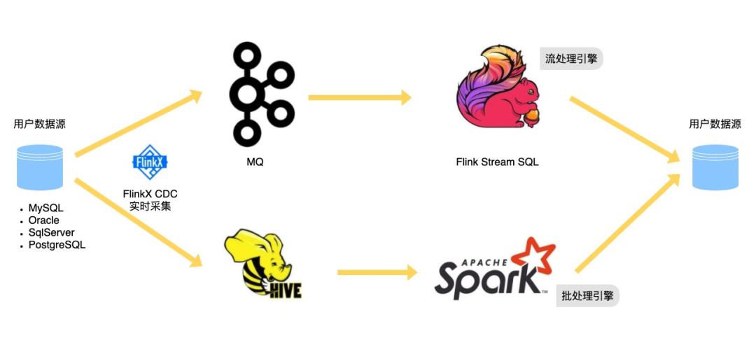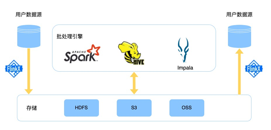 如图所示,用户业务数据通过FlinkX导入Hive数仓,通过Spark引擎处理业务逻辑,最终通过FlinkX再写回用户数据源。