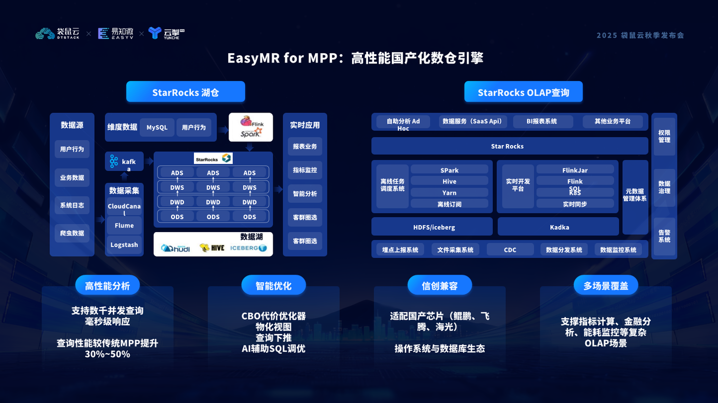 EasyMR for MPP既可以作为企业的主数据仓库,提供存储计算能力,也可以作为外部分析库,为已有仓库提供更强大的 OLAP 查询能力。在性能上,EasyMR for MPP 单节点支持数千并发查询,实现毫秒级响应,整体查询性能相比传统 MPP 提升 30% 到 50%。同时它具备 智能优化能力:CBO 代价优化器、物化视图、查询下推机制,再加上 AI 辅助 SQL 调优,让分析更智能,资源利用更高效。不仅如此,它还全面兼容信创生态,无论运行在鲲鹏、飞腾、海光芯片,还是国产操作系统与数据库环境,都能做到稳定、可控、安全。