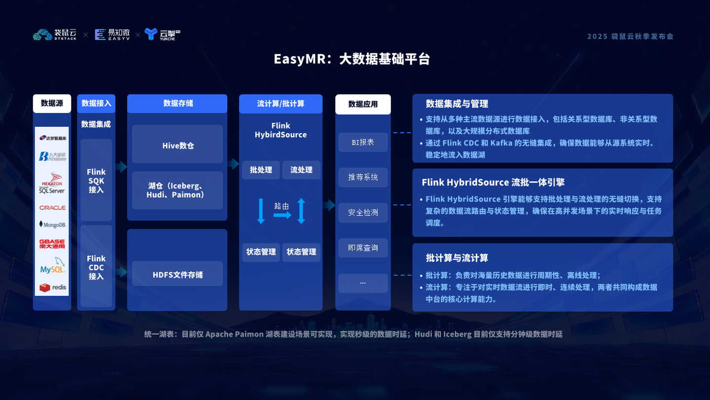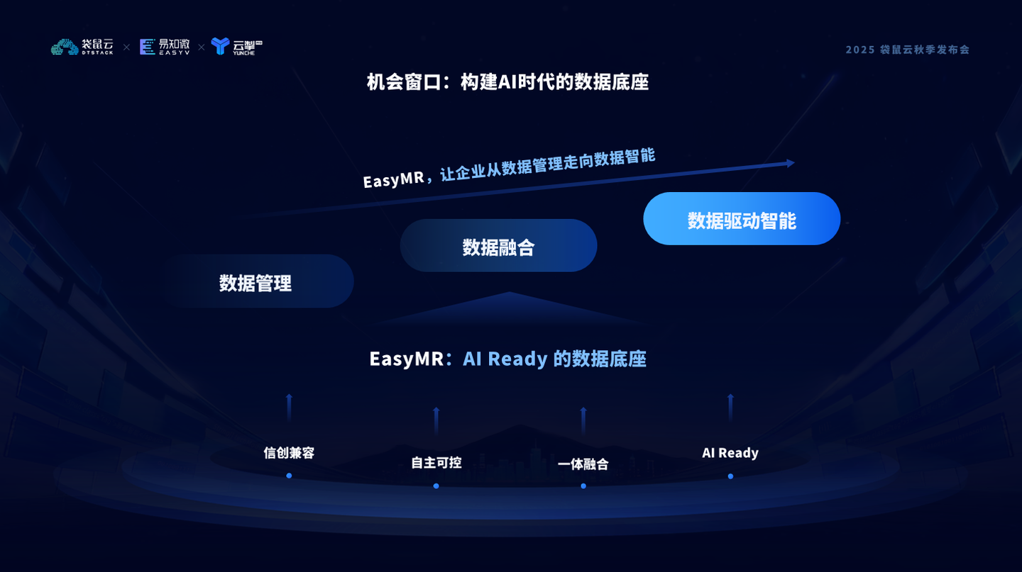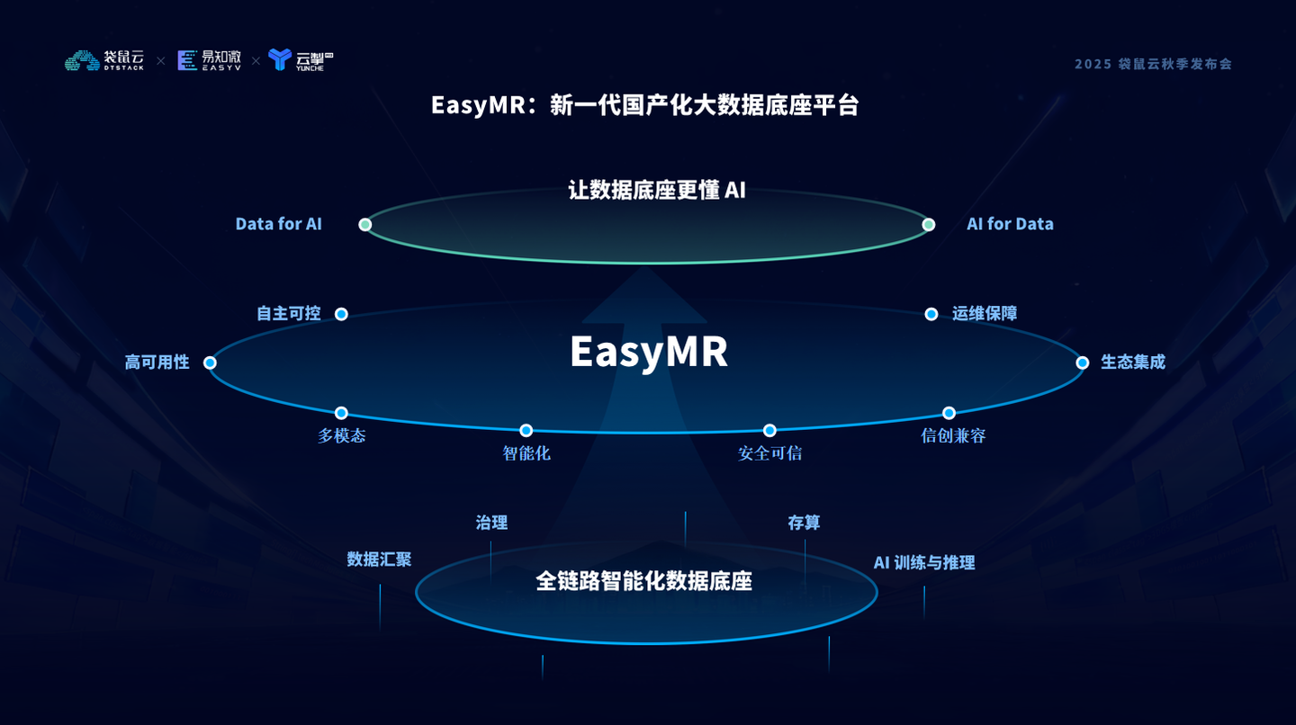 在这套底座之上,我们让企业的数据能够跨越结构壁垒,融合多模态信息,在统一架构中实现智能化处理、安全可信流转、信创环境兼容。更重要的是,EasyMR 不只是服务AI,它也在让数据底座真正理解 AI(Dataf or AI),并通过 AI for Data 反哺治理、优化资源、提升效率。