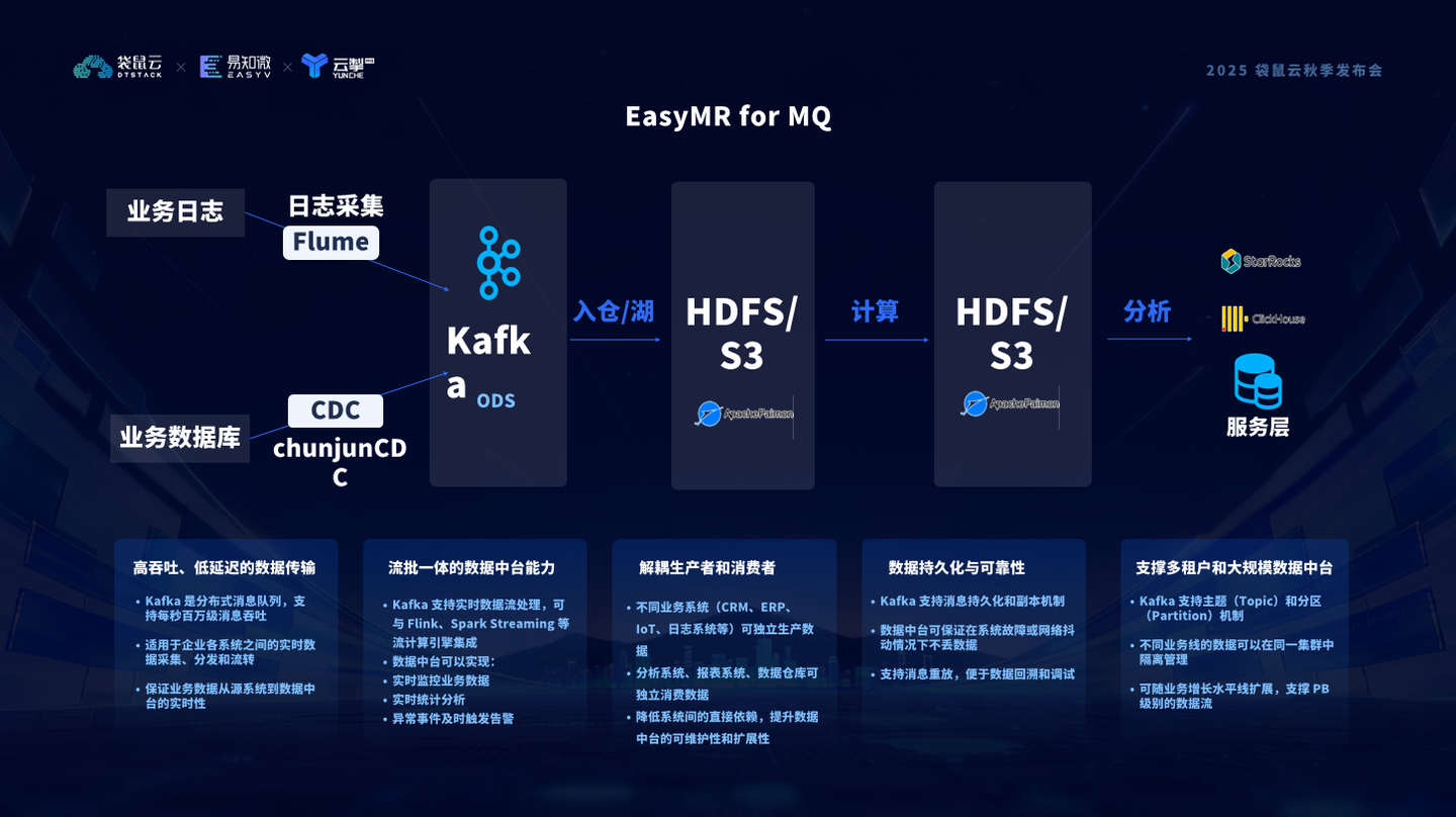 EasyMR for MQ 不仅能支撑每秒百万级消息的并发传输,还能与 Flink、Spark Streaming 深度融合,实现 流批一体化处理,让企业能够实时监控、分析、告警。更重要的是,EasyMR for MQ 通过 生产者与消费者的彻底解耦,让不同系统独立运转,极大提升了数据中台的可扩展性与稳定性。同时依托 多副本持久化与多租户隔离机制,即便在系统故障时,也能确保数据“不错一拍”。