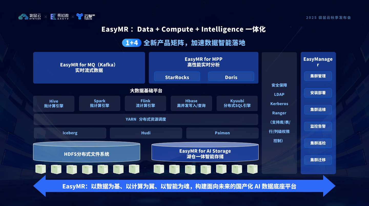 袋鼠云全新推出EasyMR“1+4”全链路产品矩阵,以 Easy Manager 智能运维平台为核心中枢,统摄大数据基础平台、EasyMR for MPP、EasyMR for MQ、EasyMR for AI Storage 四大核心引擎,形成覆盖数据采集、存储、计算、治理到AI训练与推理的全链路智能化数据底座。