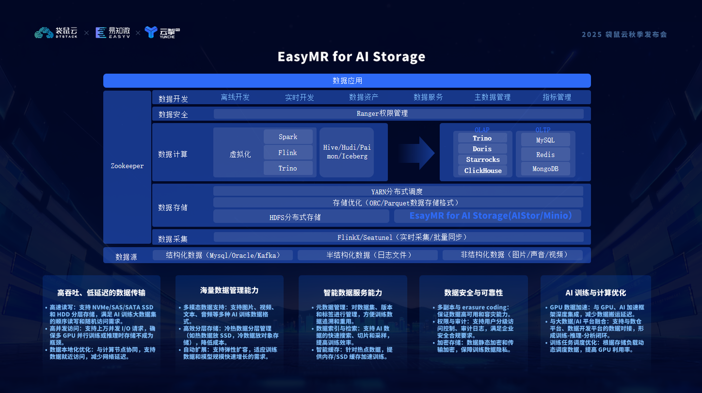 更重要的是 AI Storage 与 EasyMR 大数据基础平台、数据开发平台天然融合,让数据从采集、治理、存储,到训练与推理,形成真正意义上的智能闭环。