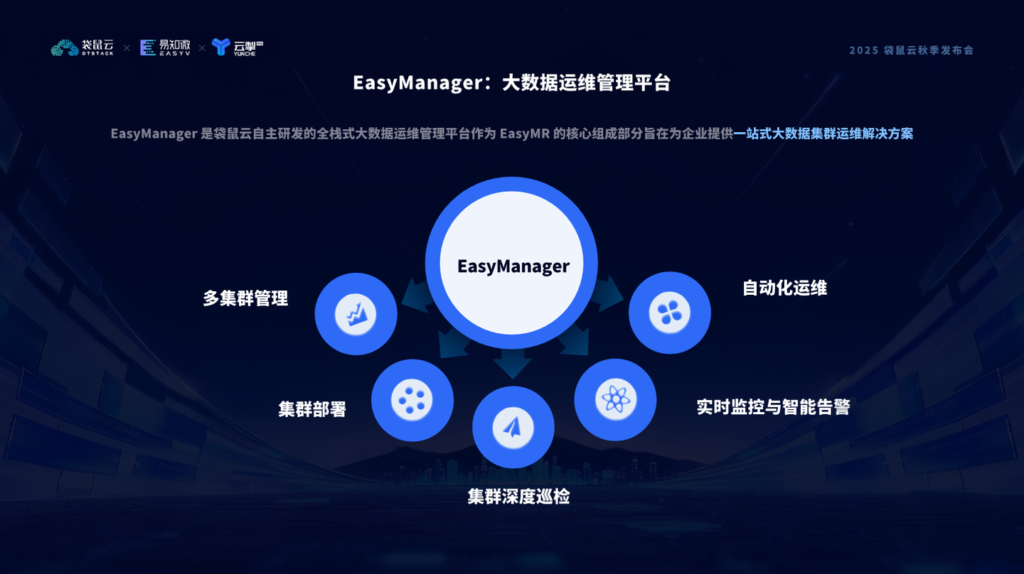 在它由袋鼠云自主研发,定位为全栈式大数据运维管理平台,也是支撑 EasyMR 全生命周期管理的关键产品。有了 Easy Manager,从集群部署到扩容、从服务安装到版本升级,都能实现一键化、自动化、图形化操作。Easy Manager 支持多集群统一管理、深度巡检与健康评估,并通过实时监控与智能告警,帮助运维团队在问题发生前就能主动发现风险。Easy Manager 是让数据底座真正实现高可用、低成本、智能化运维的基石。