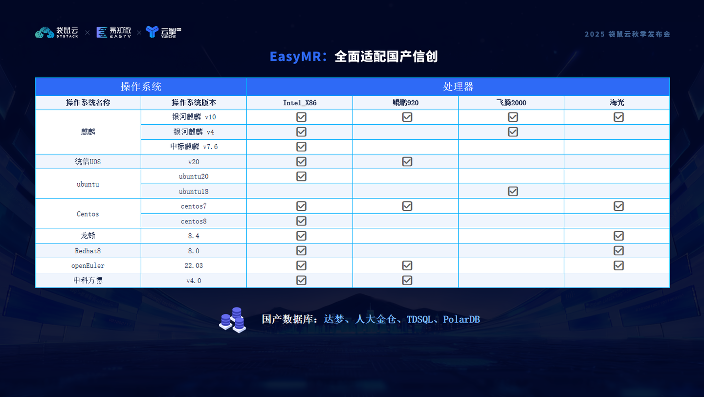 Easy MR 通过统一的存储计算架构、一体化的元数据与安全体系,以及全面的信创生态兼容,构建起支撑 AI 全链路落地的数据基础设施,真正让企业的数据为智能时代做好准备。