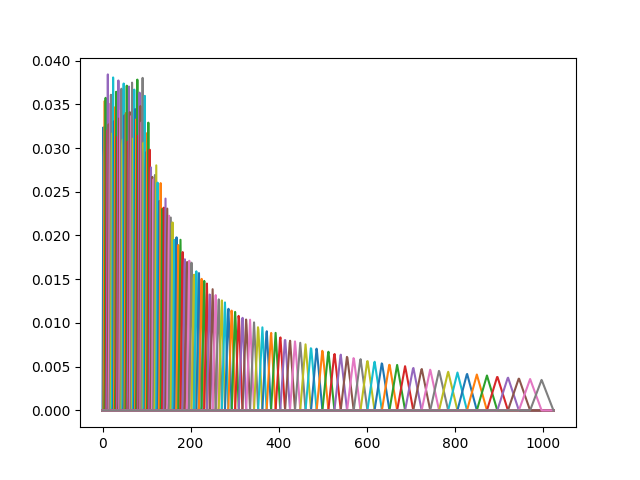 - librosa.filters.mel的返回值为一个(n_mels,n_fft/2+1)的ndarray,默认情况下是(128,1025)。在此ndarray中,每一行就是一个三角滤波器。