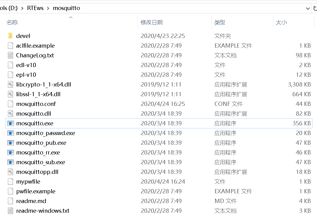 以上是mosquitto-1.6.9-install-windows-x64全貌,从文件结构上也能体会到mosquitto的简洁性。