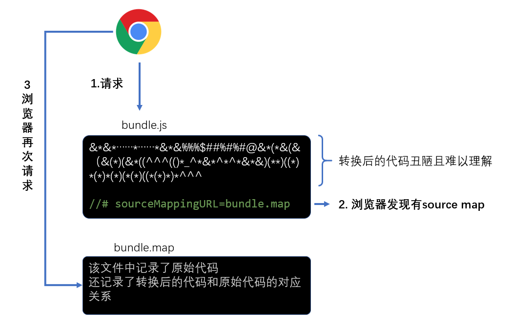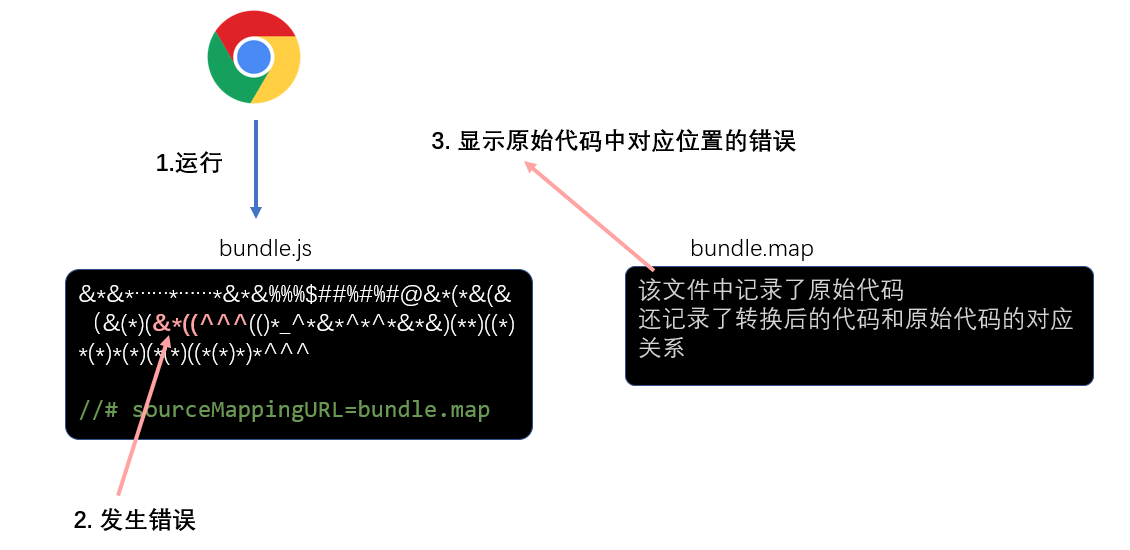 打包后的代码给调试带来了困难,因为当运行发生错误的时候,我们更加希望能看到源代码中的错误,而不是转换后代码的错误,为了解决这一问题,chrome浏览器率先支持了source map,其他浏览器纷纷效仿,目前,几乎所有新版浏览器都支持了source map,source map实际上是一个配置,配置中不仅记录了所有源码内容,还记录了和转换后的代码的对应关系。