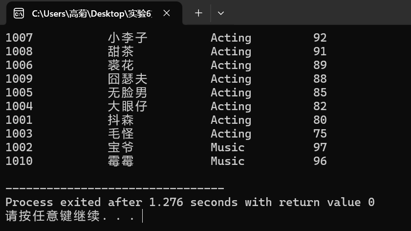 1 #pragma once 2 #include<iostream> 3 #include<iomanip> 4 #include<string> 5 #include<vector> 6 #include<fstream> 7 using namespace std; 8 9 class Count{ 10 private: 11 string id; 12 string name; 13 string major; 14 int score; 15 public: 16 Count()=default; 17 ~Count()=default; 18 int get_score()const; 19 string get_major()const; 20 friend ostream& operator<<(ostream &out,const Count &c); 21 friend istream& operator>>(istream &in,Count &c); 22 23 24 }; 25 int Count::get_score()const{ 26 return score; 27 } 28 string Count::get_major() const{ 29 return major; 30 } 31 ostream& operator<<(ostream &out,const Count &c) 32 { 33 out << setiosflags(ios_base::left); 34 out<<setw(15)<<c.id 35 <<setw(15)<<c.name 36 <<setw(15)<<c.major 37 <<setw(5)<<c.score; 38 return out; 39 40 } 41 istream& operator>>(istream &in, Count &c) 42 { 43 in>>c.id>>c.name>>c.major>>c.score; 44 return in; 45 46 }