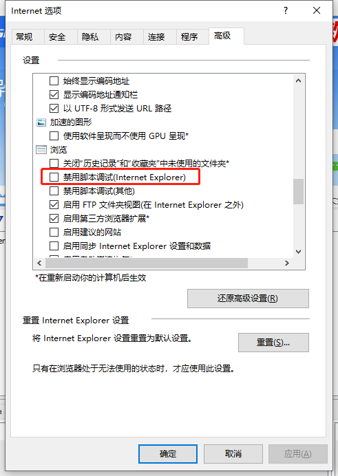 步骤:1.打开IE浏览器internet选项->高级->取消禁用脚本调试的勾选,如下图所示: