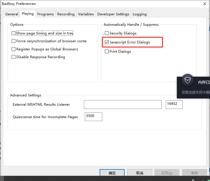 2.打开Badboy->选择Preferences->选择Playing->勾选Javascript Error Dialogs